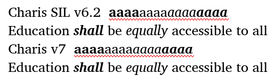 The default line spacing of Charis has been significantly decreased. In the past, line spacing had to be extreme to avoid clipping of tall letters and high diacritics on Windows. This is no longer a problem, so we’ve been able to reduce the default line spacing to be more similar to other common text fonts. We continue to recommend that you set line spacing explicitly in your document styles and preferences, and adjust it as needed for your particular situation.
